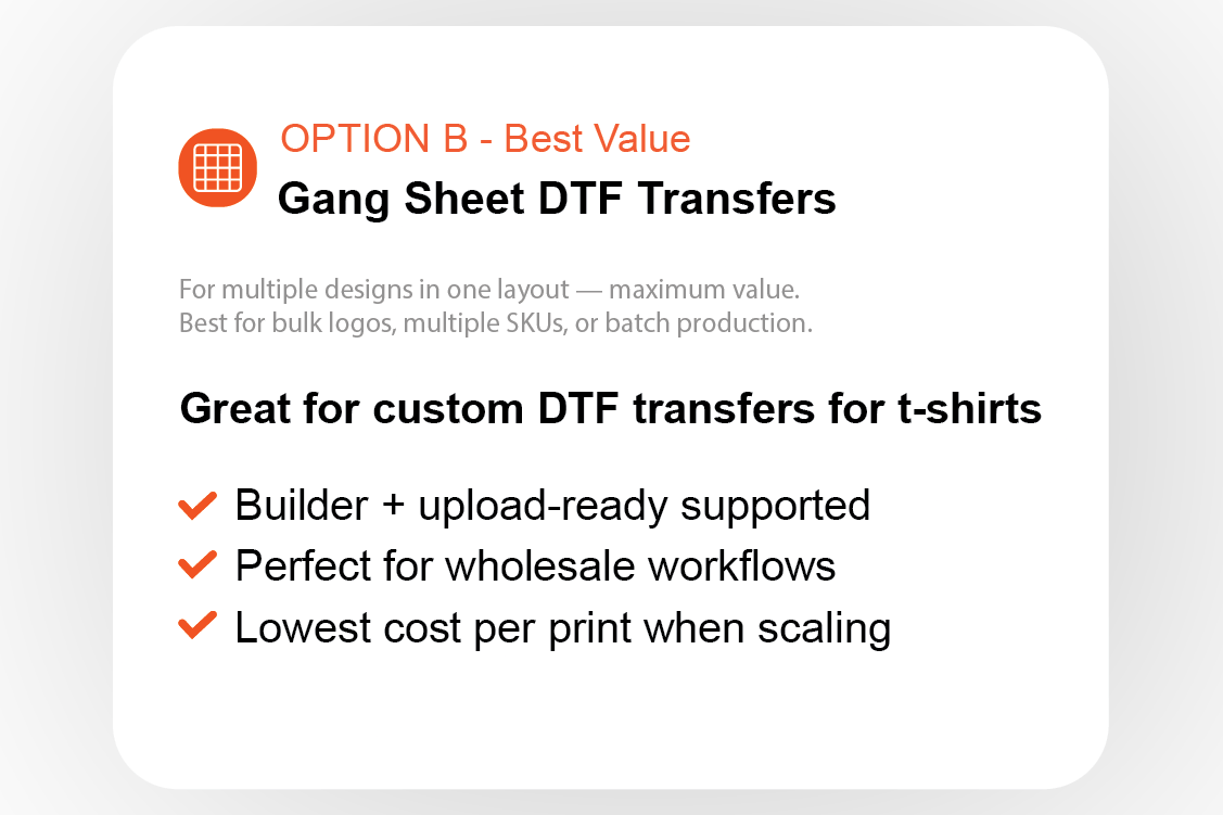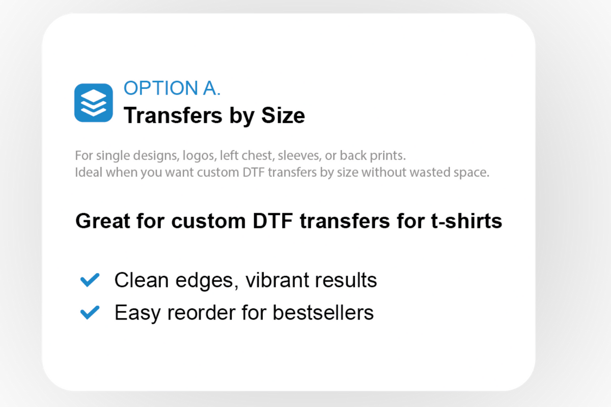Choose from a variety of transfer options including - DTF, Sublimation, and Laser. Then choose if a single sheet/print fits your needs, or a gang sheet.